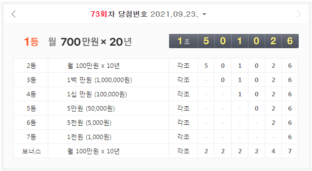 연금복권720 73회 당첨번호는 위와 같습니다.