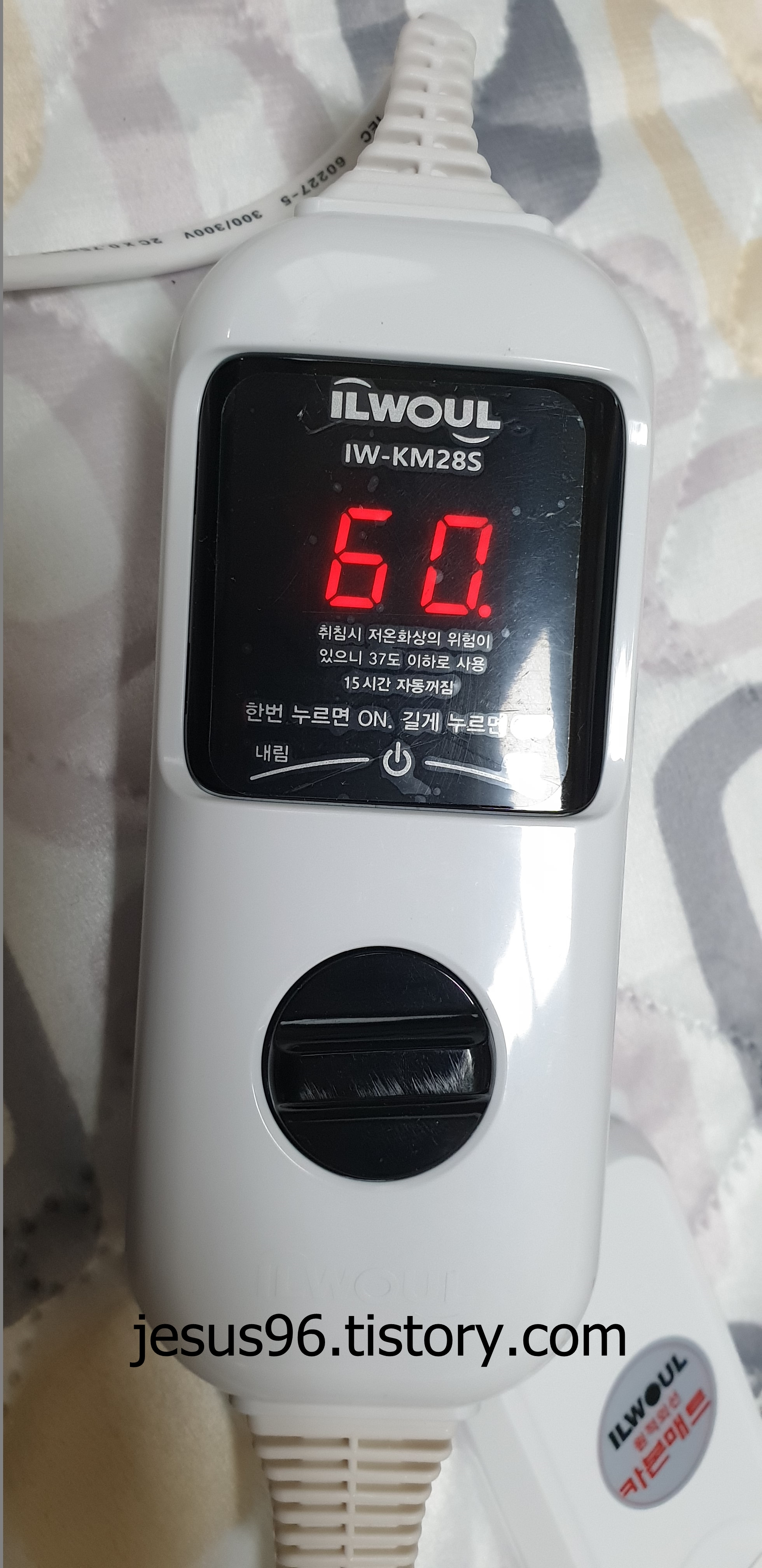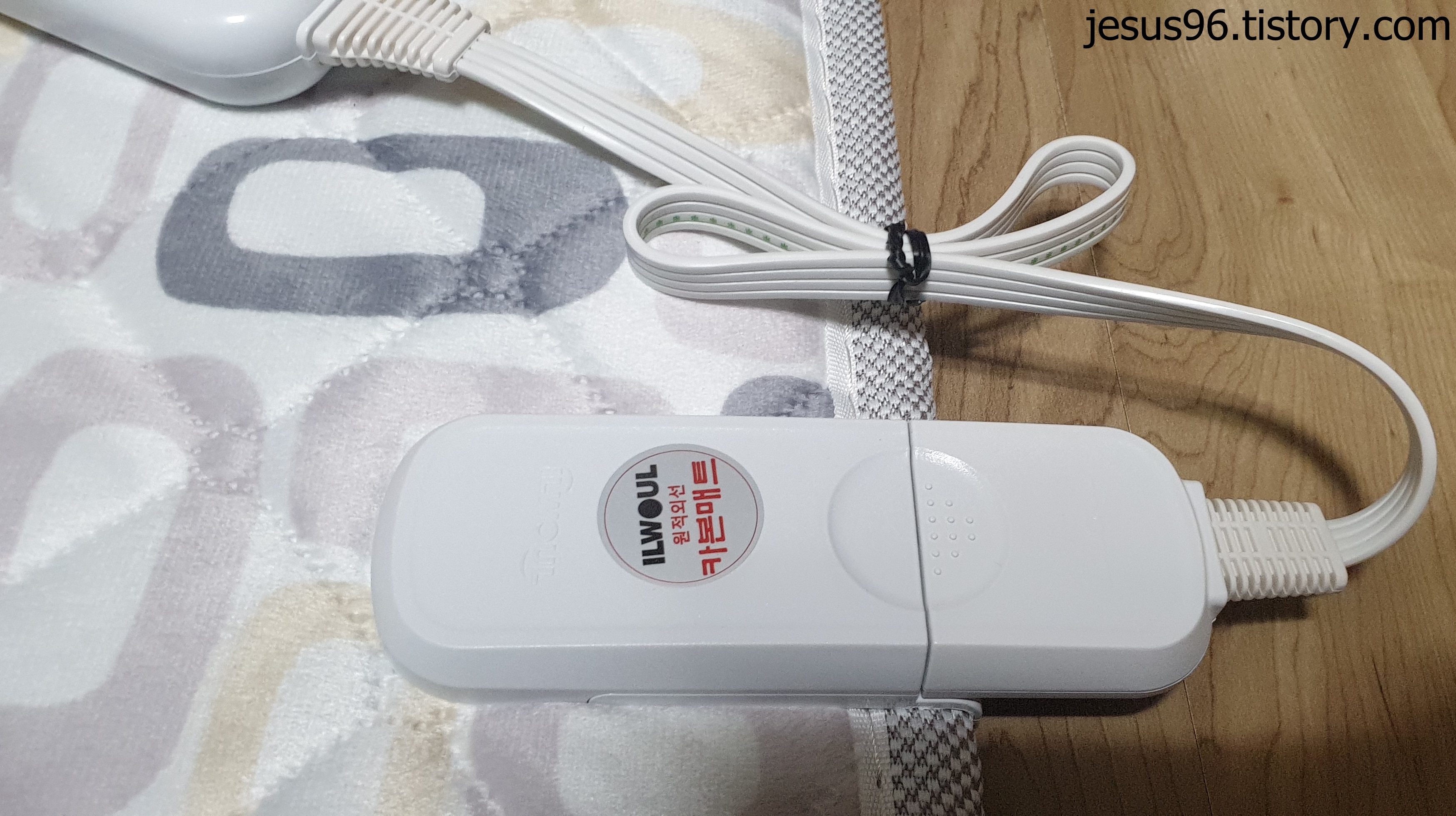 일월 온도조절기 꽂았을때 모습니다. 온도조절기가 이전에 사용하던 일월 매트는 왼쪽이면 왼쪽 위에 있었는데 이건 왼쪽 아래에 있습니다. 오른쪽으로 놔야 오른쪽 위로 갑니다. 선이 길어서 왼쪽에 두고 사용하고 있습니다.